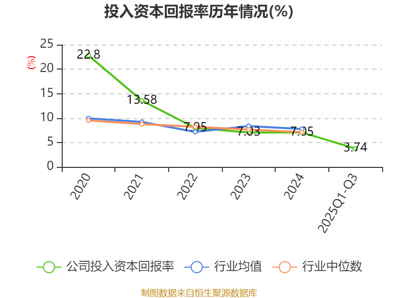 盈利能力方面, 2025年前三季度公司加权平均净资产收益率为4.04%,同比下降1.19个百分点。公司2025年前三季度投入资本回报率为3.74%,较上年同期下降1.15个百分点。