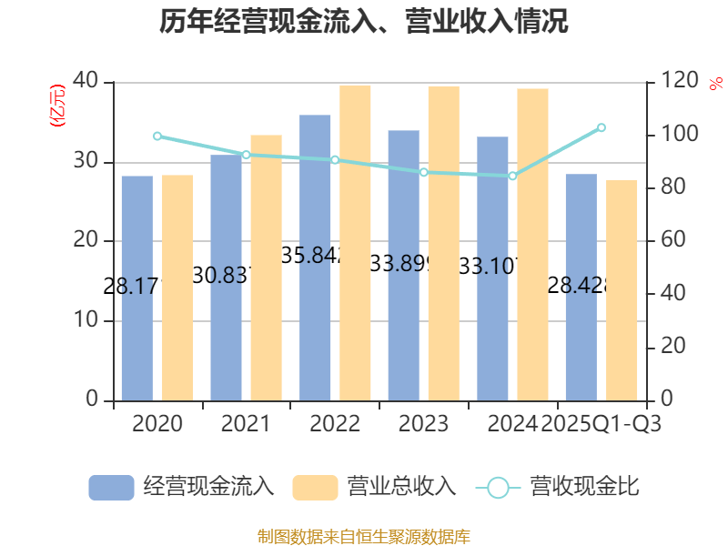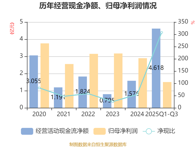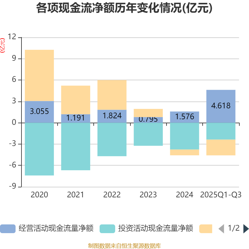 2025年前三季度,公司经营活动现金流净额为4.62亿元,同比增长650.01%;筹资活动现金流净额-2.21亿元,同比减少3.21亿元;投资活动现金流净额-2.37亿元,上年同期为-2.87亿元。