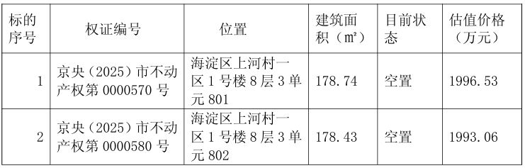 公告显示,本次拟出售的两处位于海淀区的房产目前均为“空置”状态,建筑面积分别为178.74m²和178.43m²,总计建筑面积为357.17m²。