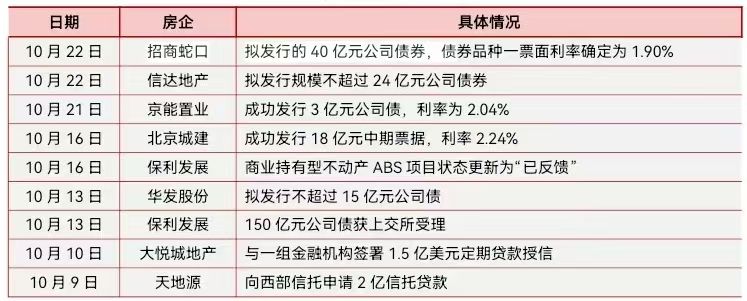 临近年底,随着土地市场供应增加,房企也在加速融资。10月22日,招商局蛇口拟发行的40亿元公司债券向专业机构投资者询价,最终确定本期债券品种一票面利率为1.90%;信达地产也启动同期公司债券发行,规模不超过24亿元。同是在10月,北京城建集团成功发行18亿元中期票据、保利发展150亿元公司债获上交所受理……