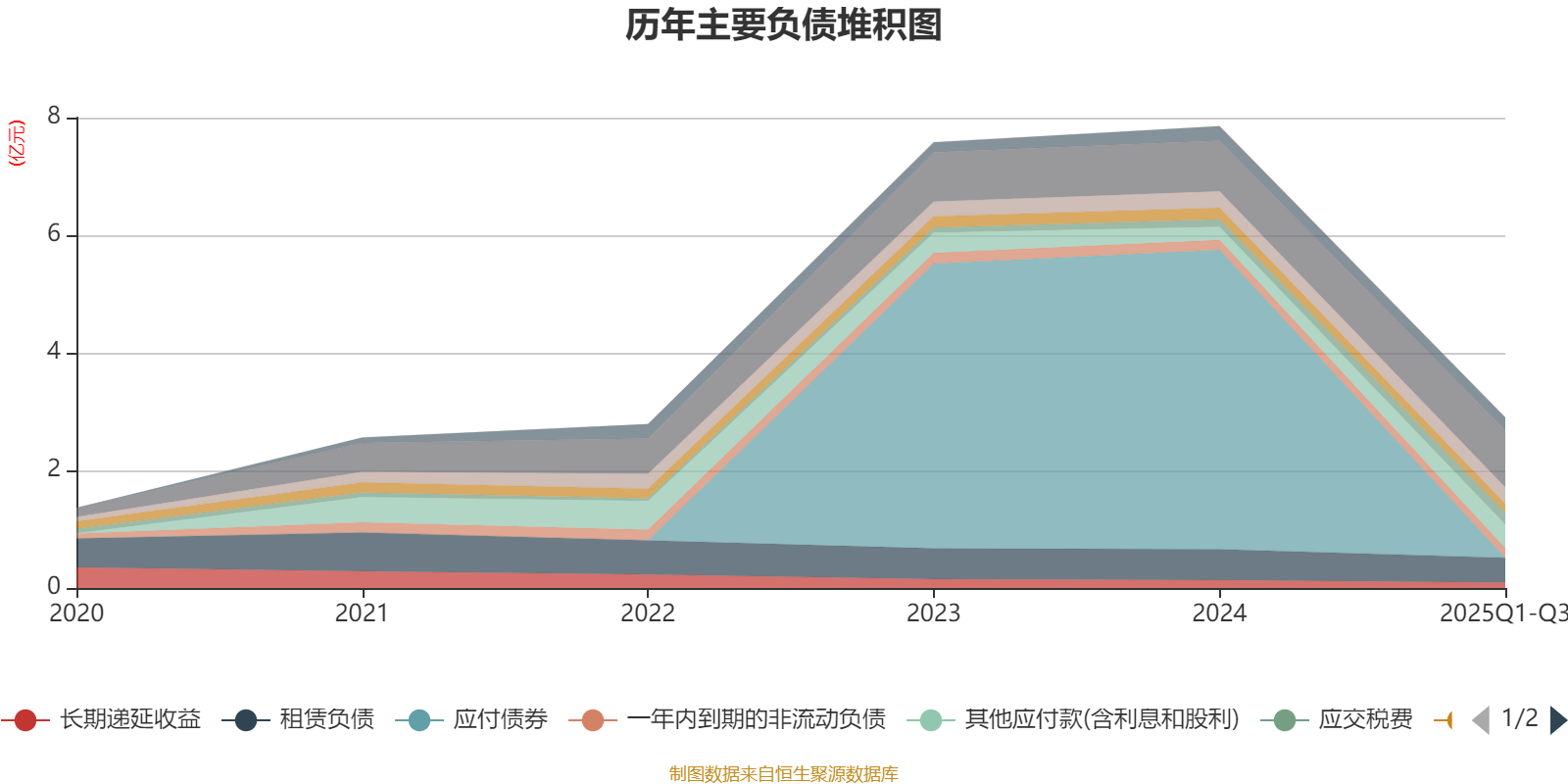 负债重大变化方面,截至2025年三季度末,公司应付债券较上年末减少100%,占公司总资产比重下降24.85个百分点;其他应付款(含利息和股利)较上年末增加81.34%,占公司总资产比重上升0.75个百分点;租赁负债较上年末减少19.44%,占公司总资产比重下降0.63个百分点;应交税费较上年末增加51.79%,占公司总资产比重上升0.27个百分点。