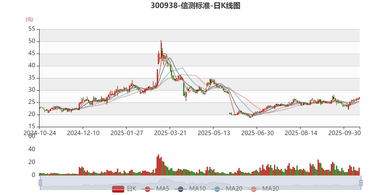 中证智能财讯信测标准(300938)10月24日披露2025年第三季度报告。前三季度公司实现营业总收入5.97亿元,同比增长8.31%;归母净利润1.55亿元,同比增长8.33%;扣非净利润1.44亿元,同比增长8.93%;经营活动产生的现金流量净额为1.29亿元,同比下降8.99%;报告期内,信测标准基本每股收益为0.6855元,加权平均净资产收益率为10.31%。