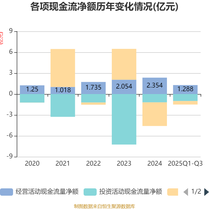 2025年前三季度,公司经营活动现金流净额为1.29亿元,同比下降8.99%;筹资活动现金流净额-5066.65万元,同比增加2.82亿元;投资活动现金流净额-9986.65万元,上年同期为7676.87万元。