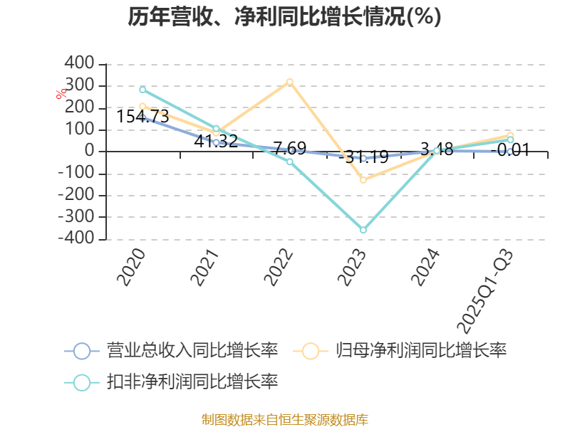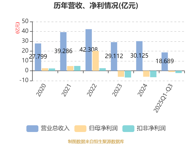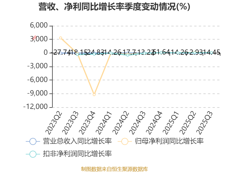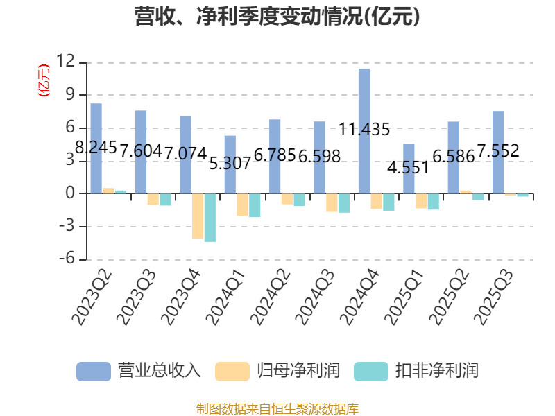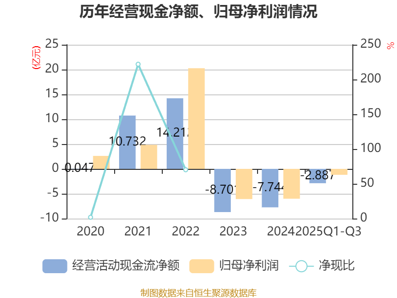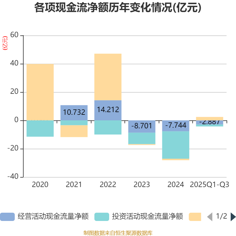 2025年前三季度,公司经营活动现金流净额为-2.89亿元,同比增加5.62亿元;筹资活动现金流净额2.41亿元,同比增加2.66亿元;投资活动现金流净额-1.41亿元,上年同期为-3.87亿元。