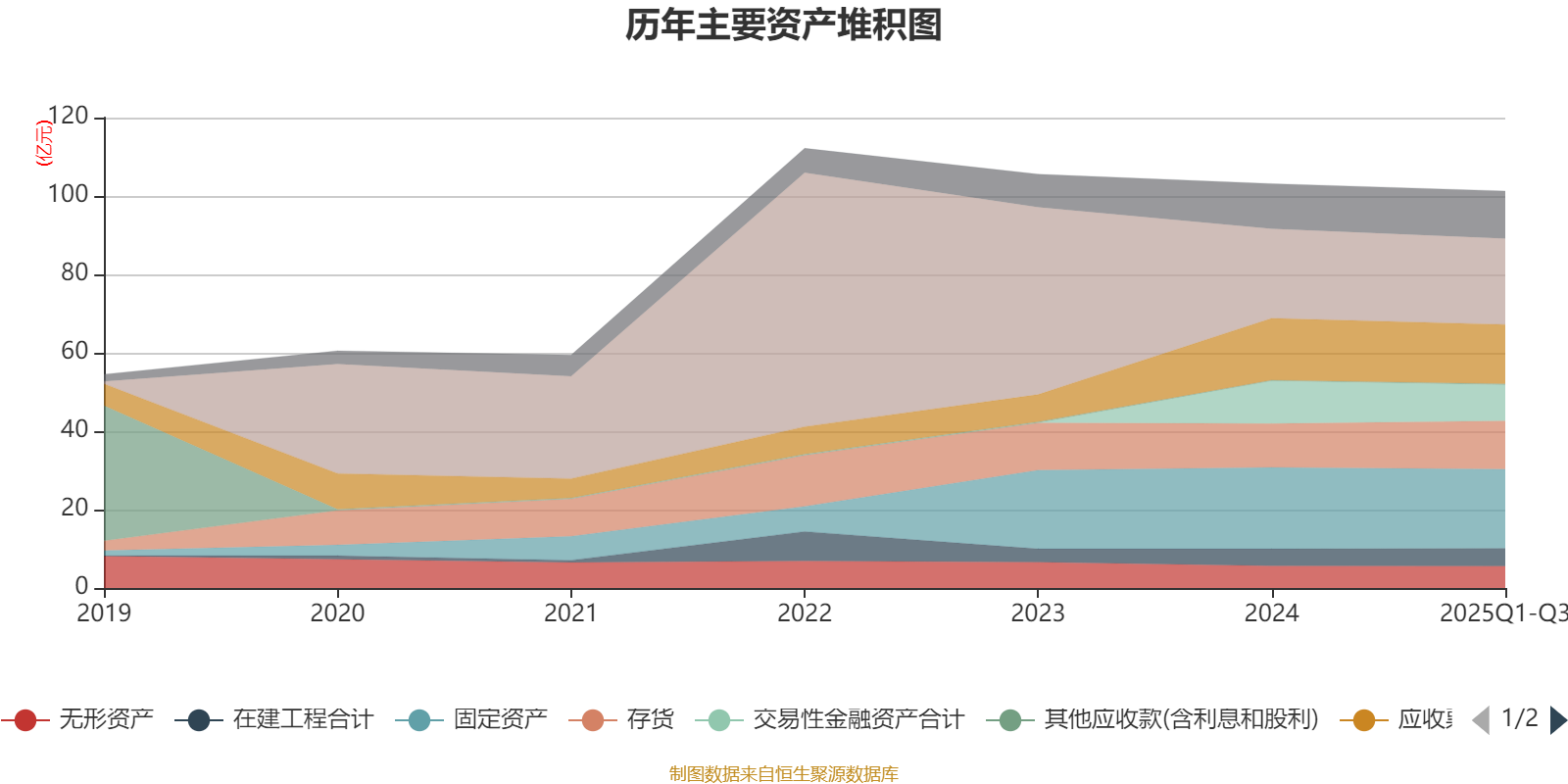 资产重大变化方面,截至2025年三季度末,公司交易性金融资产合计较上年末减少15.37%,占公司总资产比重下降1.46个百分点;存货较上年末增加10.61%,占公司总资产比重上升1.37个百分点;其他流动资产较上年末增加18.7%,占公司总资产比重上升0.65个百分点;货币资金较上年末减少4.02%,占公司总资产比重下降0.5个百分点。