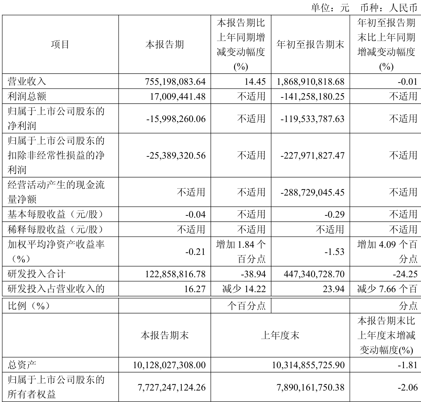 中证智能财讯华大智造(688114)10月24日披露2025年第三季度报告。前三季度公司实现营业总收入18.69亿元,同比下降0.01%;归母净利润亏损1.2亿元,上年同期亏损4.63亿元;扣非净利润亏损2.28亿元,上年同期亏损4.97亿元;经营活动产生的现金流量净额为-2.89亿元,上年同期为-8.5亿元;报告期内,华大智造基本每股收益为-0.29元,加权平均净资产收益率为-1.53%。