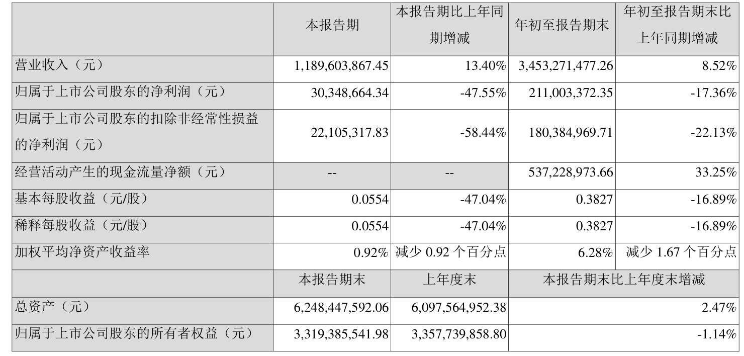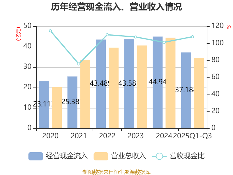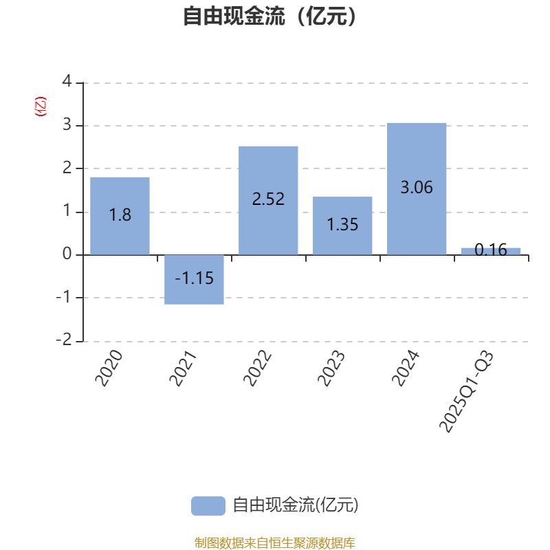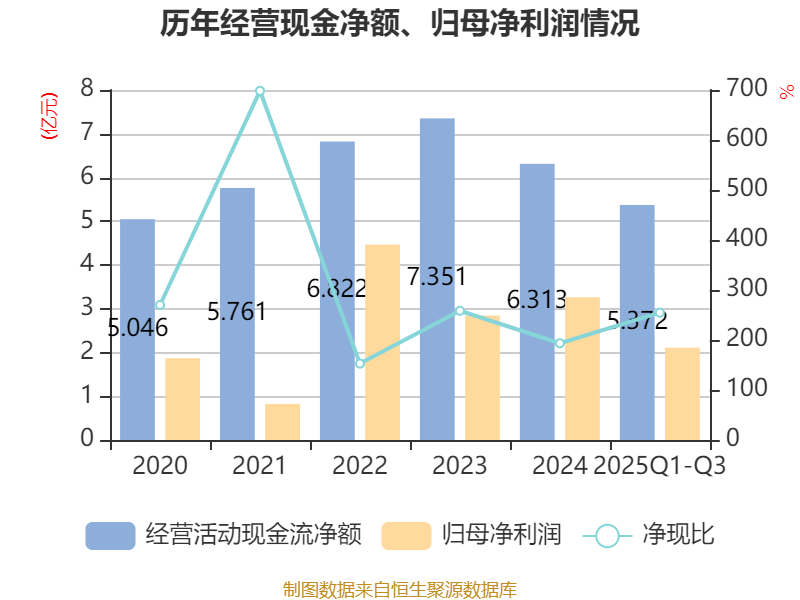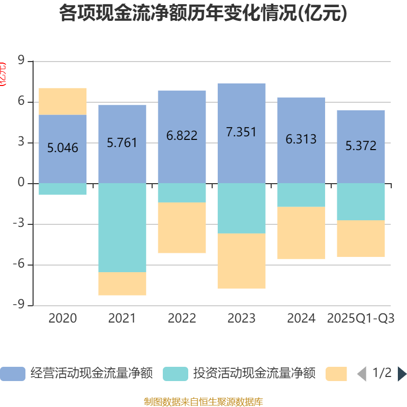 2025年前三季度,公司经营活动现金流净额为5.37亿元,同比增长33.25%;筹资活动现金流净额-2.7亿元,同比增加925.07万元;投资活动现金流净额-2.74亿元,上年同期为-9866.04万元。