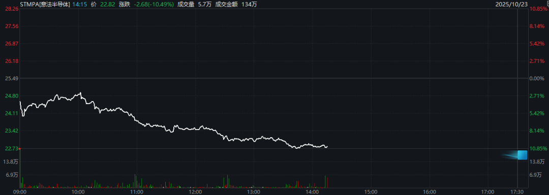 欧洲半导体巨头——意法半导体(STM.N)周四发布了最新财报,由于公司业绩展望不及预期,让公司股价大幅下跌。截至发稿,在巴黎证券交易所和米兰证券交易所上市的意法半导体股票均大跌超10%,其中,在米兰证券交易所上市的意法半导体股票一度触发暂停交易。同时,公司美股盘前亦跌超10%。