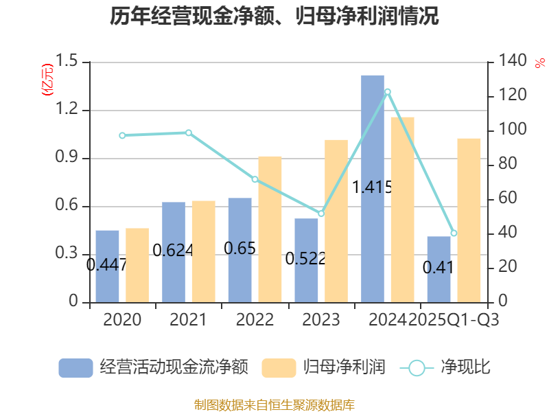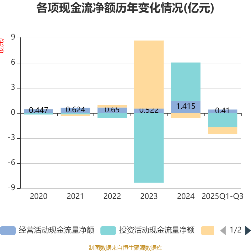 2025年前三季度,公司经营活动现金流净额为4102.11万元,同比下降21.84%;筹资活动现金流净额-8191.99万元,同比减少2176.72万元;投资活动现金流净额-1.71亿元,上年同期为2.89亿元。