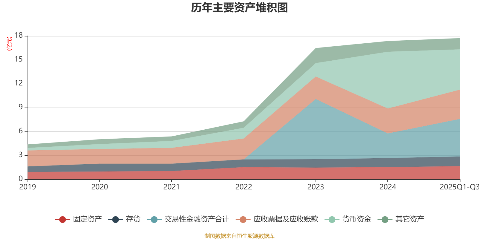 资产重大变化方面,截至2025年三季度末,公司货币资金较上年末减少28.97%,占公司总资产比重下降12.51个百分点;交易性金融资产合计较上年末增加52.31%,占公司总资产比重上升8.77个百分点;应收票据及应收账款较上年末增加17.38%,占公司总资产比重上升2.69个百分点;在建工程合计较上年末减少33.74%,占公司总资产比重下降0.68个百分点。