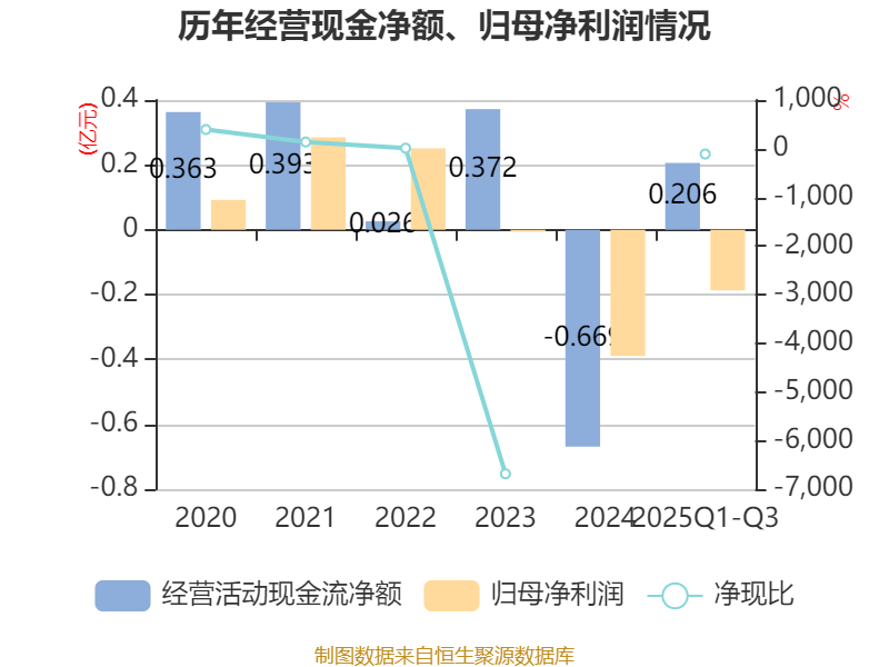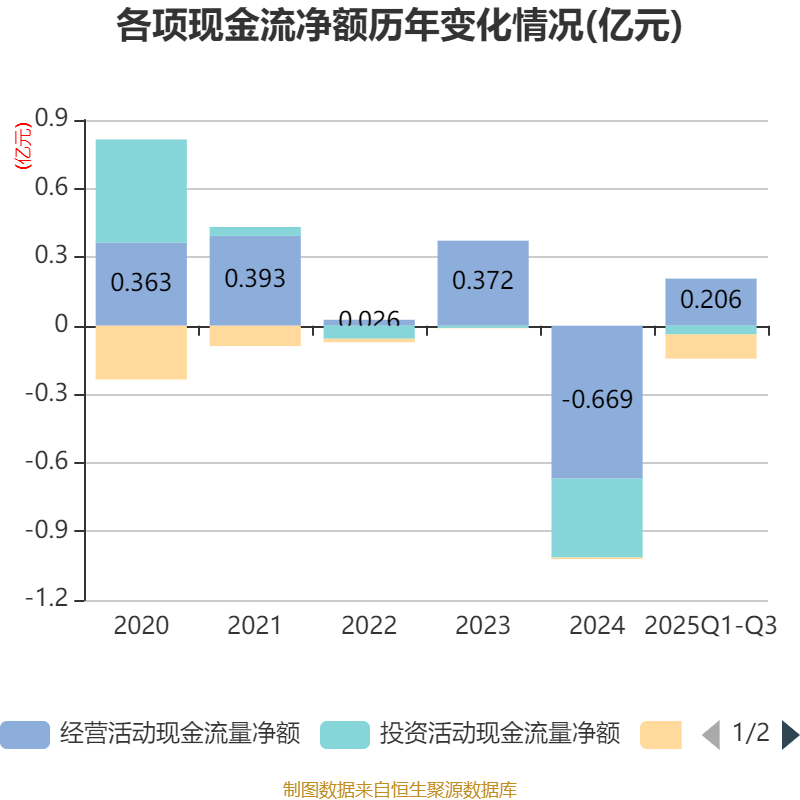 2025年前三季度,公司经营活动现金流净额为2063.18万元,同比增加7007.1万元;筹资活动现金流净额-1060.02万元,同比减少999.57万元;投资活动现金流净额-384.91万元,上年同期为-905.84万元。