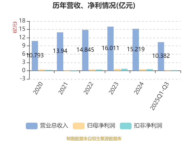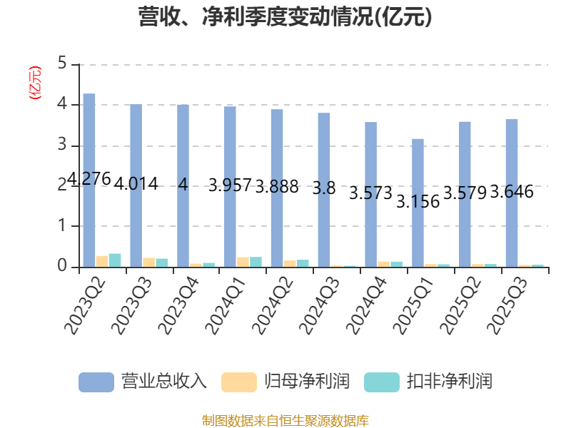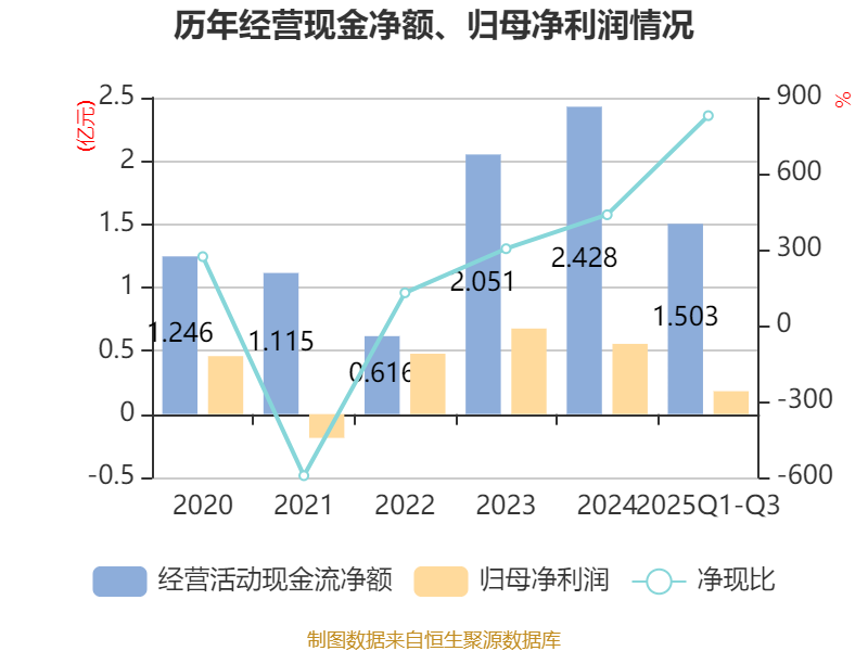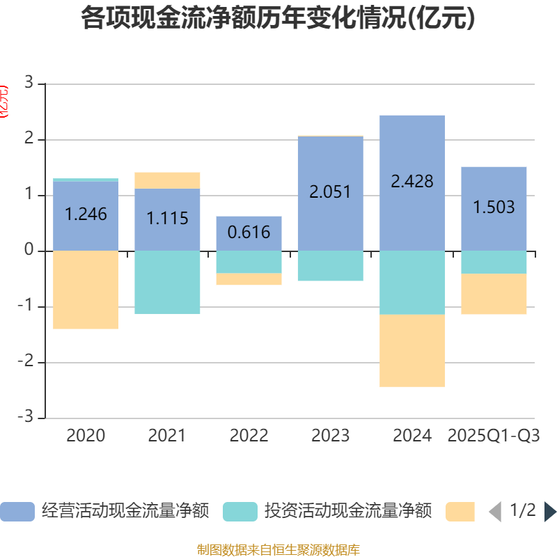 2025年前三季度,公司经营活动现金流净额为1.5亿元,同比下降25.61%;筹资活动现金流净额-7266.1万元,同比减少1967.57万元;投资活动现金流净额-4154.82万元,上年同期为-8826.89万元。