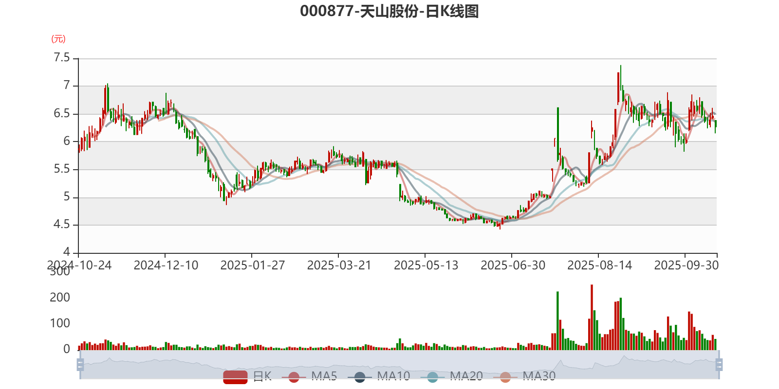 中证智能财讯天山股份(000877)10月24日披露2025年第三季度报告。前三季度公司实现营业总收入549.38亿元,同比下降10.64%;归母净利润亏损11.81亿元,上年同期亏损37.47亿元;扣非净利润亏损15.68亿元,上年同期亏损41.1亿元;经营活动产生的现金流量净额为48.69亿元,同比增长43.50%;报告期内,天山股份基本每股收益为-0.166元,加权平均净资产收益率为-1.44%。