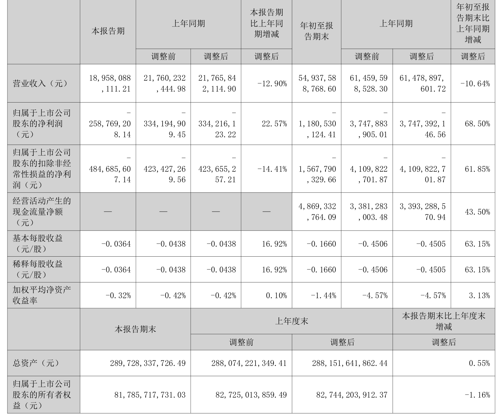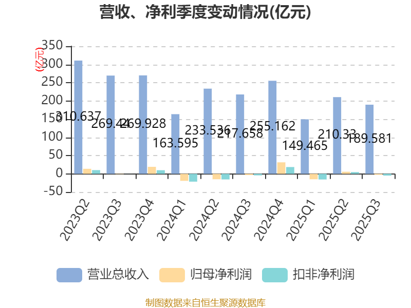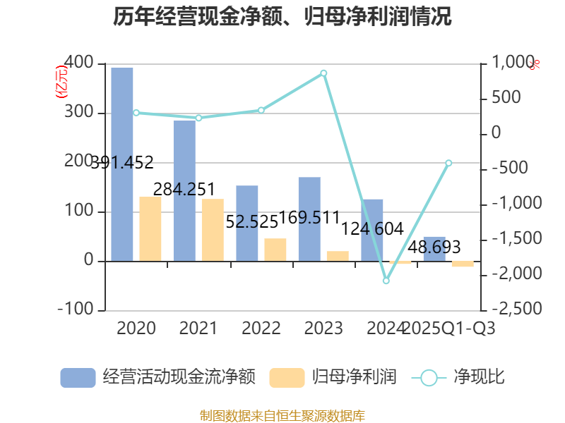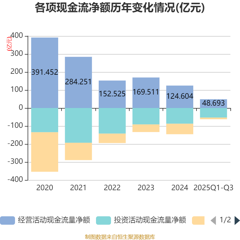 2025年前三季度,公司经营活动现金流净额为48.69亿元,同比增长43.5%;筹资活动现金流净额-9.19亿元,同比减少44.87亿元;投资活动现金流净额-53.11亿元,上年同期为-72.49亿元。