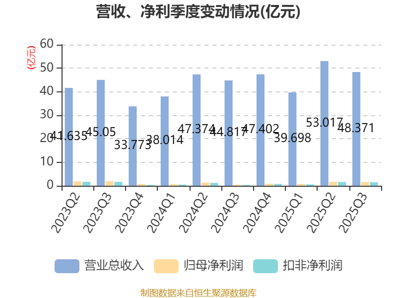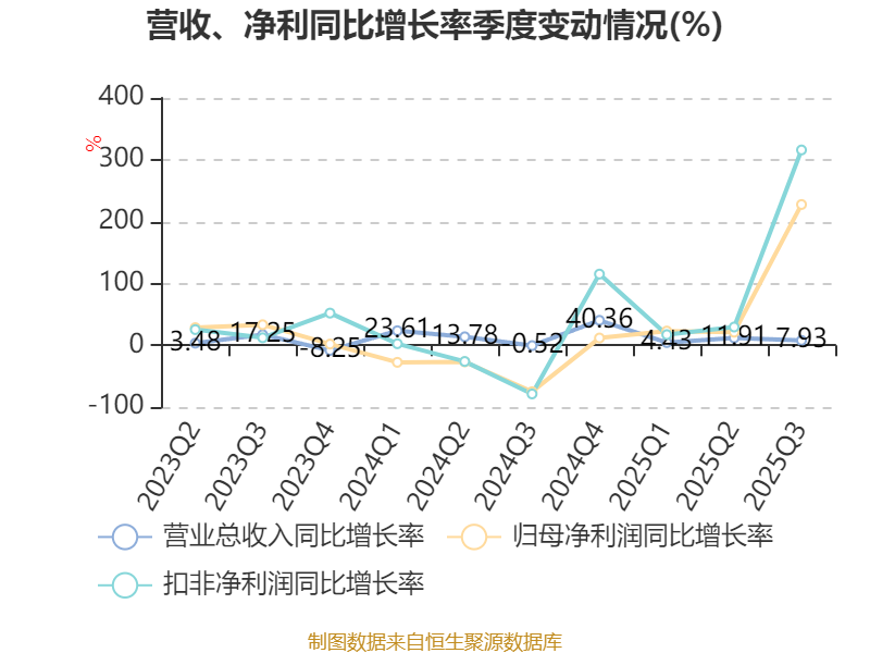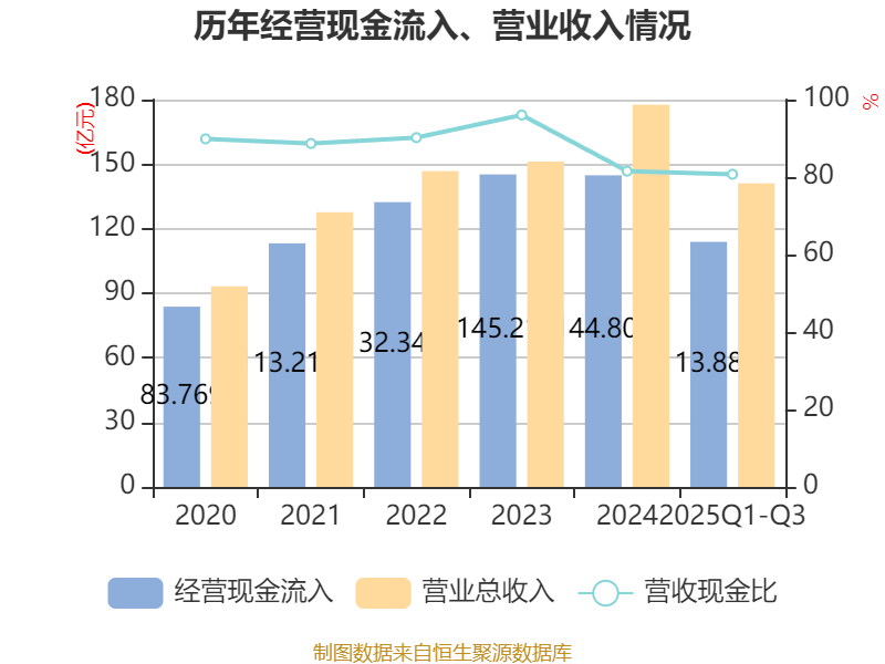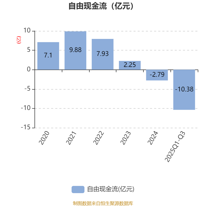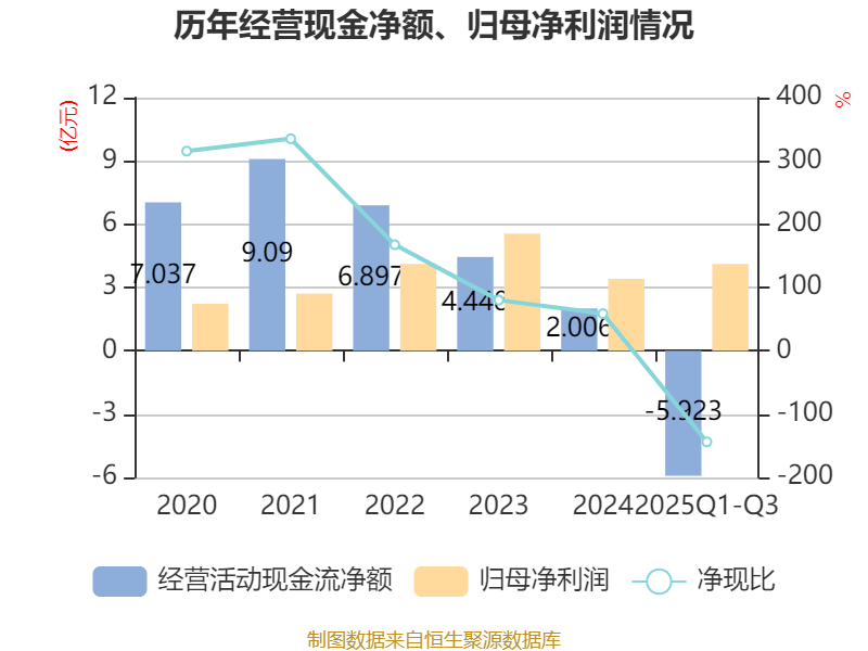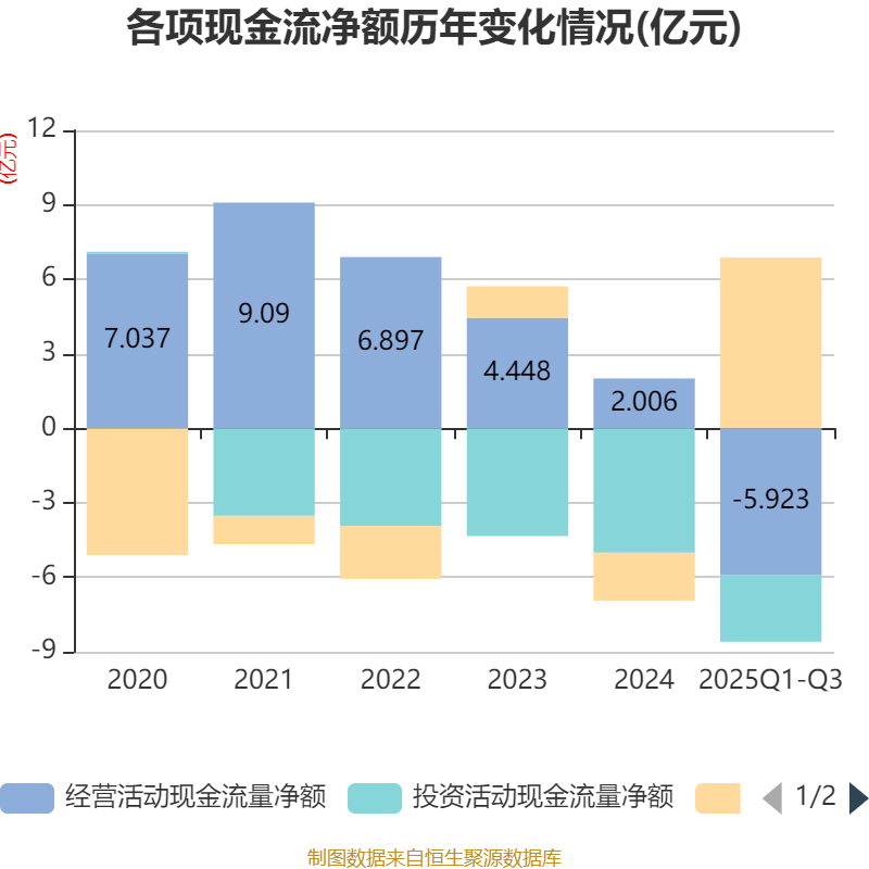 2025年前三季度,公司经营活动现金流净额为-5.92亿元,同比减少5.41亿元;筹资活动现金流净额6.88亿元,同比增加7.98亿元;投资活动现金流净额-2.67亿元,上年同期为-2.71亿元。
