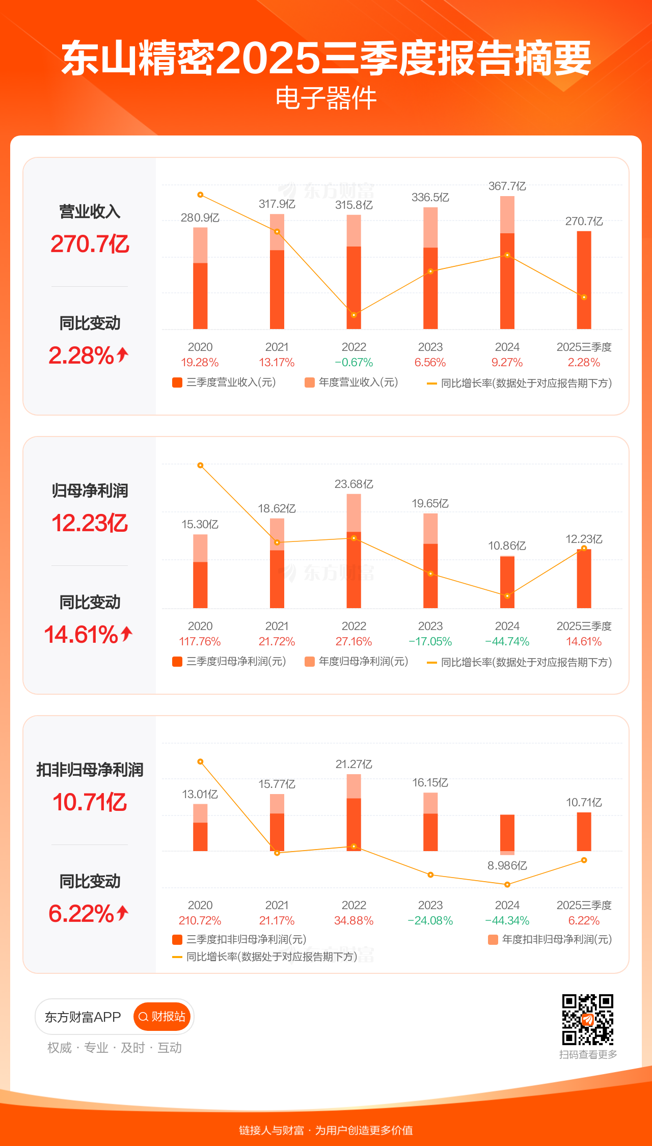 东山精密10月22日发布2025年三季报显示,公司前三季实现营业收入270.71亿元,同比增长2.28%;归母净利润12.23亿元,同比增长14.61%;扣非归母净利润10.71亿元,同比增长6.22%。每股EPS0.70元,低于机构一致预测的1.48元。