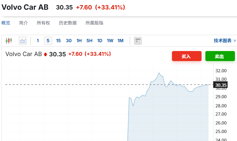 10月23日,沃尔沃汽车股价在斯德哥尔摩一度上涨41%,创下上市四年来最大盘中涨幅。