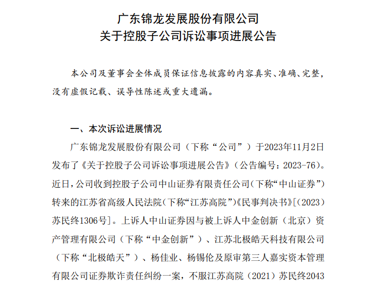 10月23日晚间,锦龙股份发布控股子公司诉讼事项进展公告,其控股子公司中山证券与中金创新、北极皓天等主体的证券欺诈责任纠纷案迎来终审,中山证券在30%范围内与北极皓天承担连带赔偿责任。