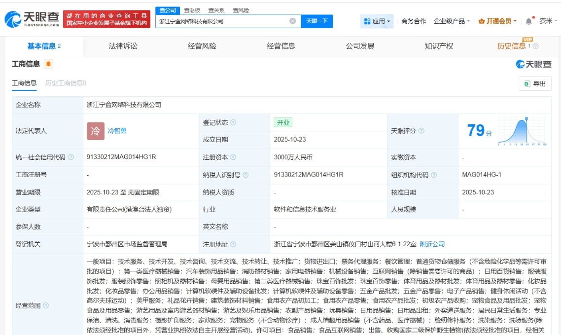 每经AI快讯,天眼查App显示,近日,浙江宁盒网络科技有限公司成立,法定代表人为冷智勇,注册资本3000万元人民币,经营范围包括货物进出口、票务代理服务、餐饮管理等,由盒马(中国)有限公司全资持股。