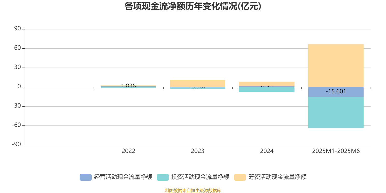 2025年1月至6月,公司经营活动现金流净额为-15.6亿元,同比减少12.77亿元;筹资活动现金流净额66.02亿元,同比增加59.15亿元;投资活动现金流净额-48.43亿元,上年同期为-9657万元。