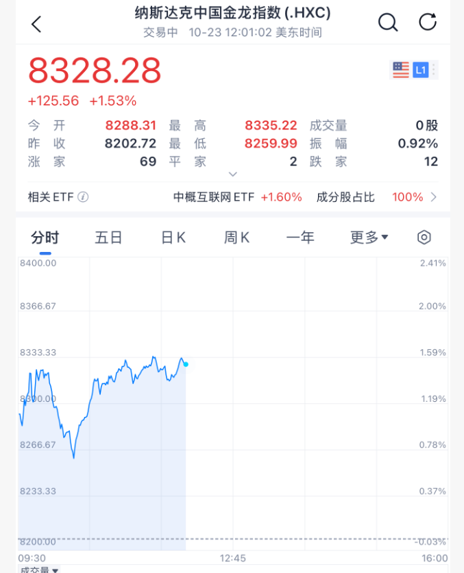 中概股指数大涨1.5%左右。