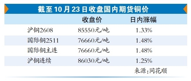 记者留意到,10月以来铜价持续高位运行,一度创下15个月以来的新高。伦敦金属交易所(LME)的铜期货价格,今年截至10月中旬已上涨超20%。截至10月23日20时40分,纽约铜主连报5.0830美元/磅,日内涨幅1.75%。国内方面,沪铜主连合约10月23日收盘报86070元/吨,日内涨幅1.27%。