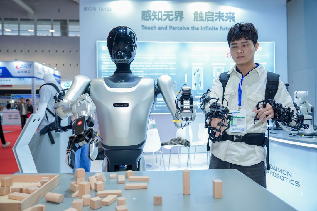 展会现场,戴盟以“触觉感知·智启未来”为主题,设置了多个沉浸式体验区。观众可与戴盟Sparky 1人形机器人化身“分拣员”,完成物品抓取、桌面整理及积木堆叠等高精度任务,亲身感受人机协作的流畅与精准;还可通过穿戴遥操作数据采集设备,实时操控人形机器人完成一比一动作模仿,体验“穿搭达人”灵活操控。配合UI界面,戴盟DM-Tac系列视触觉传感器等产品实时触摸信息,如形貌、力的方向清晰可见,充分展现戴盟在触觉感知与灵巧操作领域的技术深度。展位现场交流热烈,专业访客络绎不绝。