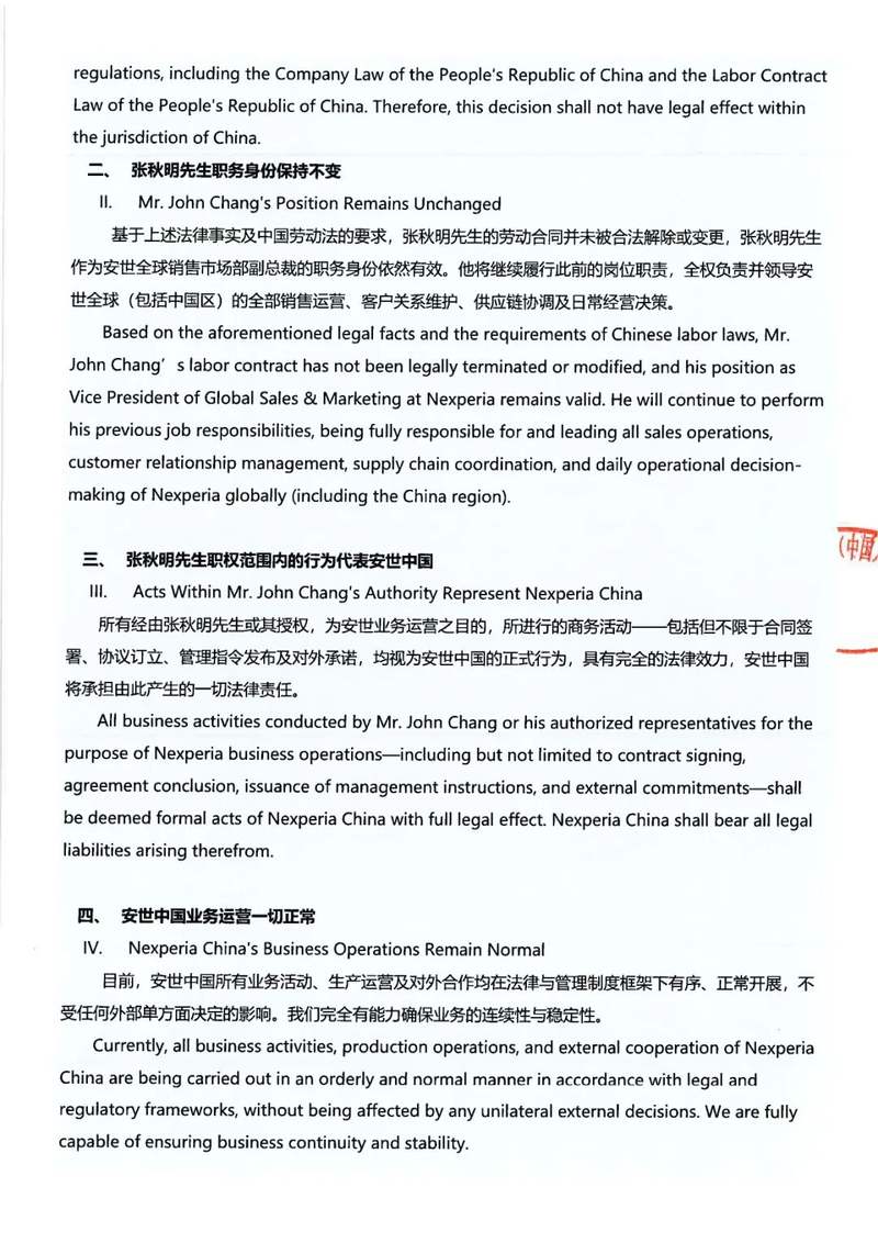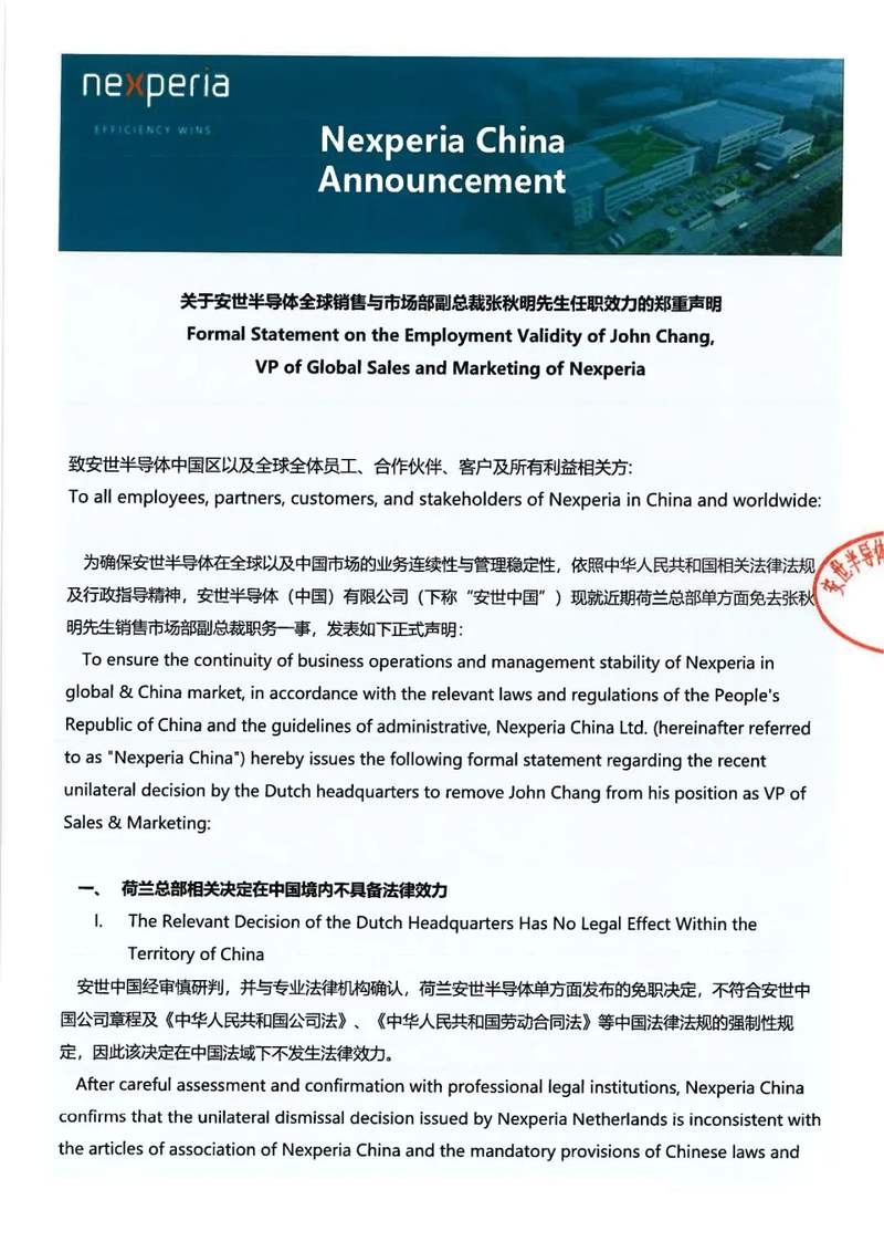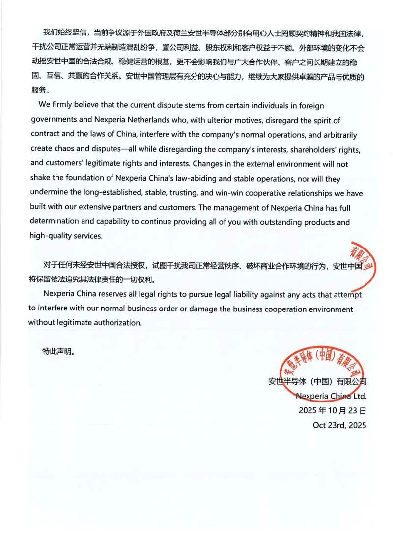 据人民财讯10月23日电安世半导体中国有限公司公众号发布关于安世半导体全球销售与市场副总裁张秋明先生任职效力的郑重声明,为确保安世半导体在全球以及中国市场的业务连续性与管理稳定性,依照中华人民共和国相关法律法规及行政指导精神,安世半导体(中国)有限公司(下称“安世中国”)现就近期荷兰总部单方面免去张秋明先生销售市场部副总裁职务一事,发表如下正式声明:一、荷兰总部相关决定在中国境内不具备法律效力;二、张秋明职务身份保持不变;三、张秋明先生职权范围内的行为代表安世中国;四、安世中国业务运营一切正常,目前,安世中国所有业务活动、生产运营及对外合作均在法律与管理制度框架下有序、正常开展,不受任何外部单方面决定的影响。我们完全有能力确保业务的连续性与稳定性。