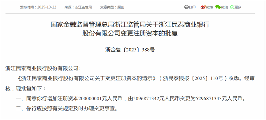 蓝鲸新闻10月23日讯(记者金磊)10月22日,国家金融监督管理总局浙江监管局发布批复,同意浙江民泰商业银行(以下简称民泰银行)增加注册资本约2亿元,由约50.97亿元变更为约52.97亿元。