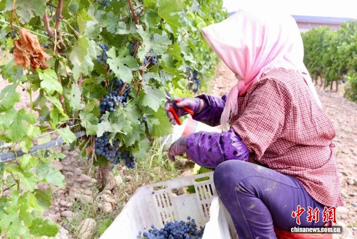 今年9月,农户在贺兰山东麓一处酿酒葡萄基地采摘成熟的酿酒葡萄。(资料图) 中新网记者于晶摄
