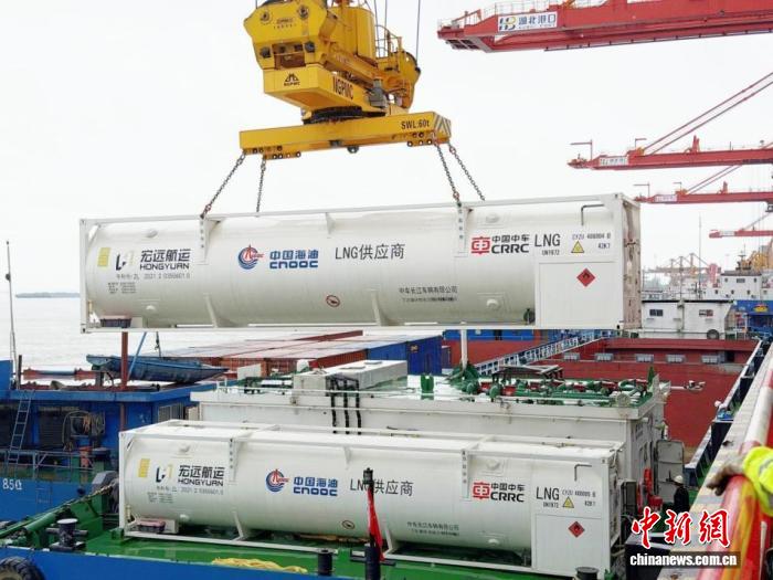10月18日,由中车长江集团研制的LNG动力船舶可换装燃料供气系统在武汉长江新区阳逻港完成换罐展示。(资料图)(中车集团供图)