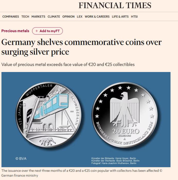 据英国《金融时报》23日报道,德国这一举措将影响到一枚25欧元和一枚20欧元硬币在未来三个月的发行计划。前者每枚含22克纯银,按当前银价计算价值约29欧元;此前发行的版本最高曾卖到45.95欧元;后者含有16.6克纯银。