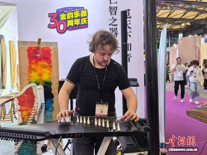 在Music China2025上,外国音乐爱好者体验中国民族乐器。(中新网记者陈静摄)