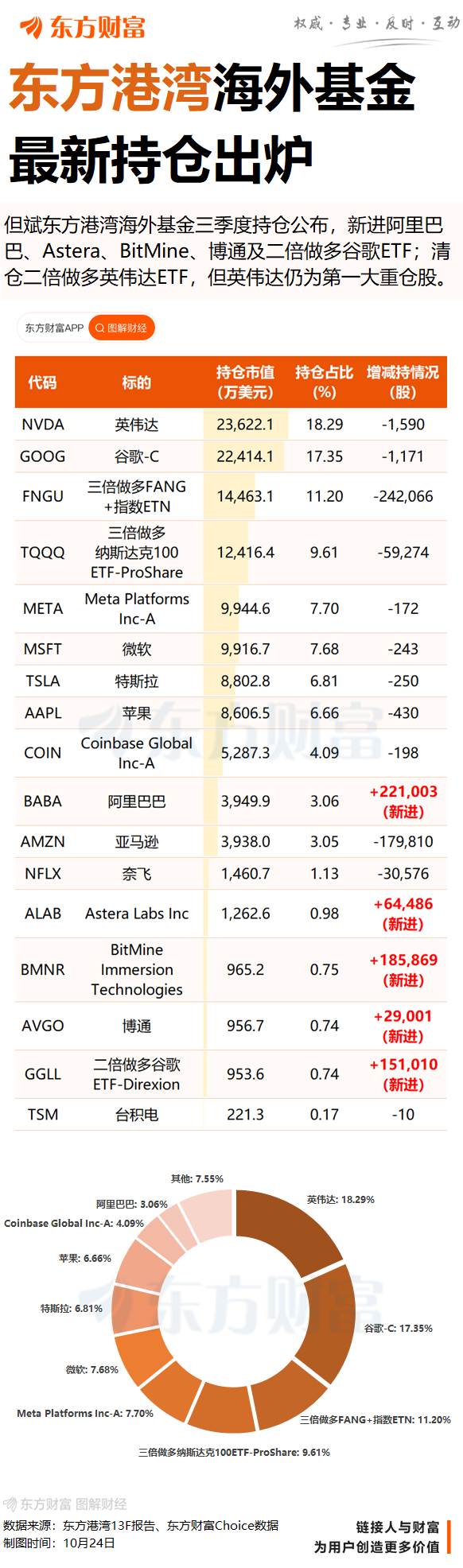 但斌在三季度新买入5股,其中大举买入阿里巴巴,英伟达、谷歌依然位列前两大重仓股,并强化AI产业链布局,新进了两家半导体公司——博通、Astera Labs,同时大幅减持亚马逊和奈飞,清仓了2倍做多英伟达ETF。