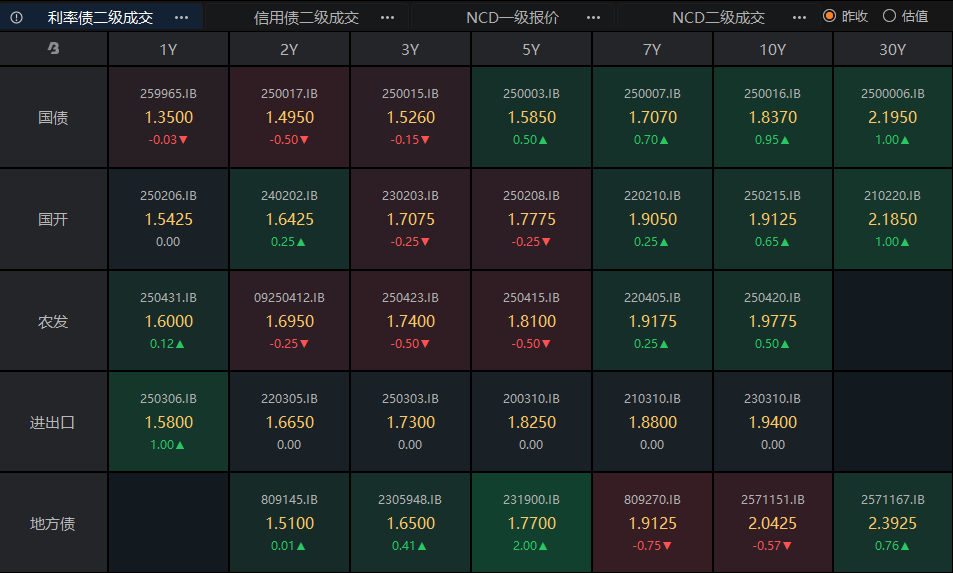 行情回顾:截至昨日18点,利率市场收益率多数上行,1Y国债下行0.03bp至1.35%,3Y国债下行0.15bp至1.53%,5Y国债上行1bp至1.59%,10Y国债上行0.55bp至1.83%,30Y国债上行0.75bp至2.19%,10Y国开收益率持平至1.91%。信用市场收益率多数小幅下行,2Y期AAA信用债下行0.5bp至1.75%,3Y期AAA信用债收益率持平至1.99%,5Y期AAA信用债下行0.25bp至2.19%。转债方面,中证转债指数昨日收盘报478点,收涨0.14%。