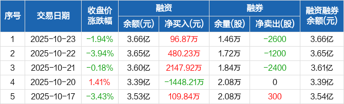 融资方面,当日融资买入4062.48万元,融资偿还3965.61万元,融资净买入96.87万元,连续3日净买入累计2725.02万元。融券方面,融券卖出200股,融券偿还2800股,融券余量1.46万股,融券余额38.44万元。融资融券余额合计3.66亿元。