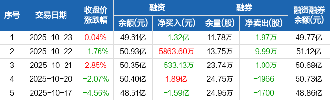 澜起科技:融资净偿还1.32亿元,两市排名第12(10-23)
