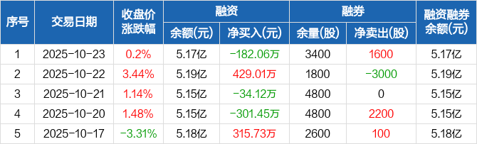 福达合金:融资净偿还182.06万元,融资余额5.17亿元(10-23)