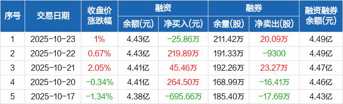 融资方面,当日融资买入1628.63万元,融资偿还1654.49万元,融资净偿还25.86万元。融券方面,融券卖出20.78万股,融券偿还6900股,融券余量211.42万股,融券余额642.72万元。融资融券余额合计4.49亿元。