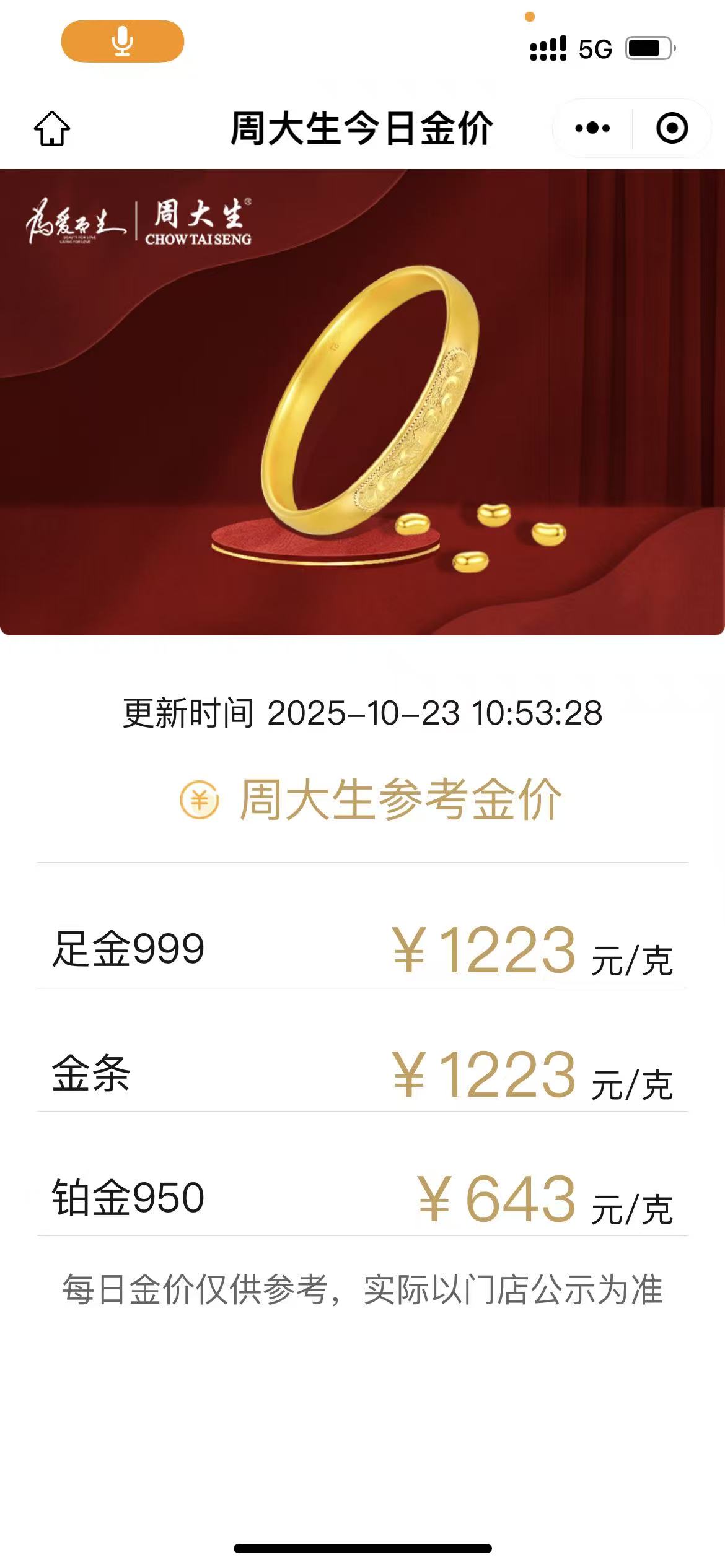 10月23日,记者在周大生看到,当日金饰价格已降低至1223元/克,此前10月21日,周大生金饰价格一度冲至1292元/克。