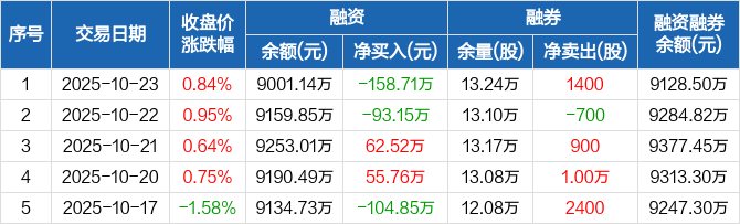 融资方面,当日融资买入185万元,融资偿还343.71万元,融资净偿还158.71万元。融券方面,融券卖出1500股,融券偿还100股,融券余量13.24万股,融券余额127.36万元。融资融券余额合计9128.5万元。