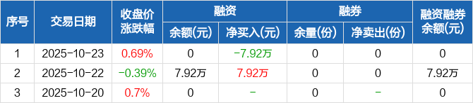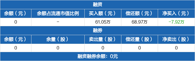 融资方面,当日融资买入61.05万元,融资偿还68.97万元,融资净偿还7.92万元。融券方面,融券卖出0份,融券偿还0份,融券余量0份,融券余额0元。融资融券余额合计0元。