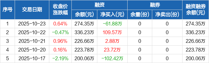 融资方面,当日融资买入64.89万元,融资偿还126.76万元,融资净偿还61.88万元。融券方面,融券卖出0份,融券偿还0份,融券余量0份,融券余额0元。融资融券余额合计274.35万元。