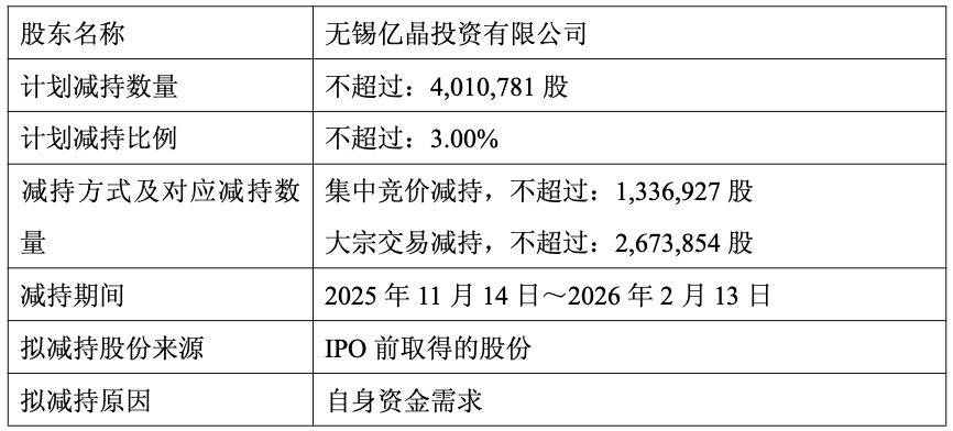 10月23日,力芯微(688601)公告,公司控股股东无锡亿晶投资有限公司计划以集中竞价交易方式和大宗交易方式,减持公司合计不超过401.08万股股份,即不超过公司总股本的3%。
