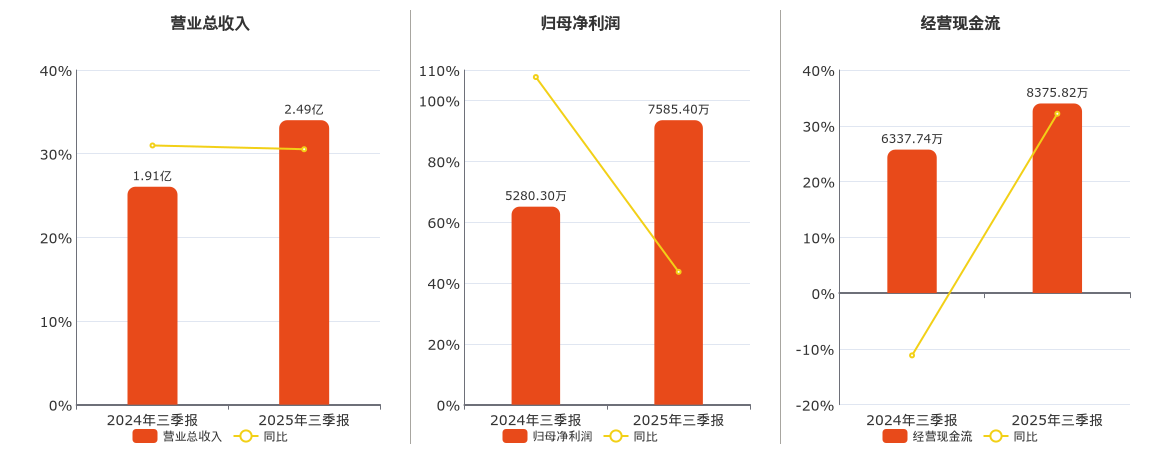 公司营业总收入为2.49亿元。归母净利润为7585.40万元。经营活动现金净流入为8375.82万元。