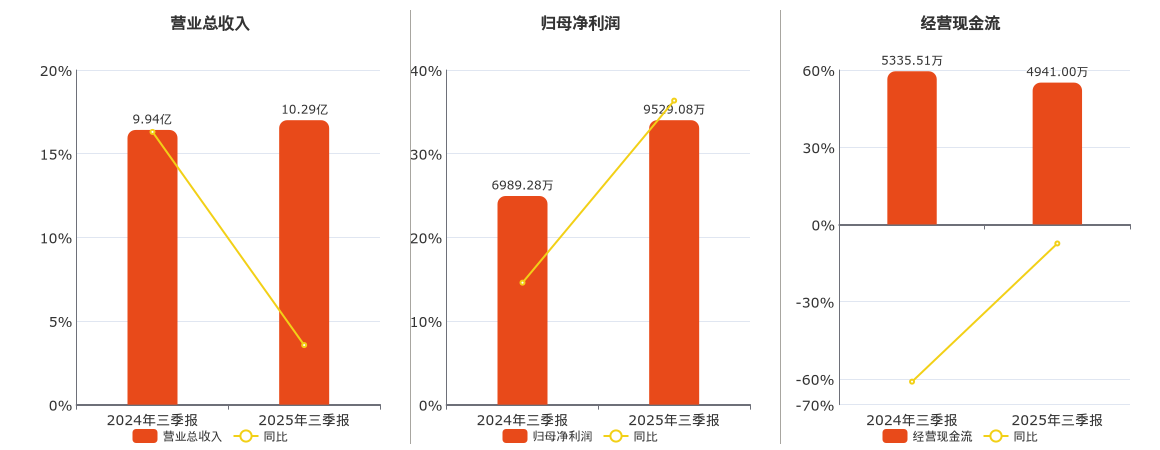 公司营业总收入为10.29亿元。归母净利润为9529.08万元。经营活动现金净流入为4941.00万元,较去年同报告期经营活动现金净流入减少394.51万元,同比较去年同期下降7.39%。