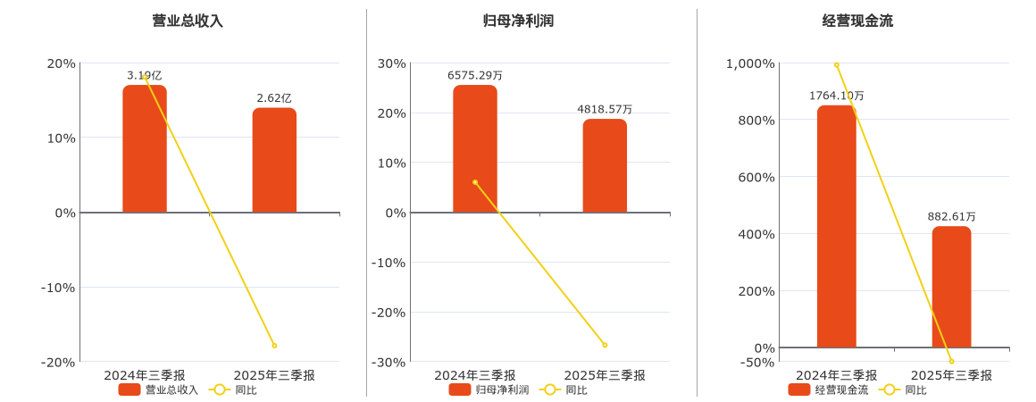 公司营业总收入为2.62亿元,较去年同报告期营业总收入减少5697.79万元,同比较去年同期下降17.89%。归母净利润为4818.57万元,较去年同报告期归母净利润减少1756.73万元,同比较去年同期下降26.72%。经营活动现金净流入为882.61万元,较去年同报告期经营活动现金净流入减少881.49万元,同比较去年同期下降49.97%。