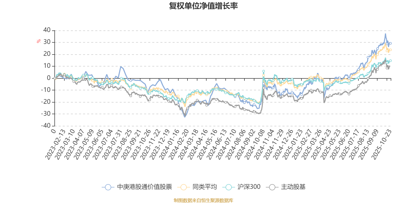 截至10月23日,中庚港股通价值股票近三个月复权单位净值增长率为16.19%,位于同类可比基金29/58;近半年复权单位净值增长率为37.87%,位于同类可比基金13/57;近一年复权单位净值增长率为38.30%,位于同类可比基金15/57。