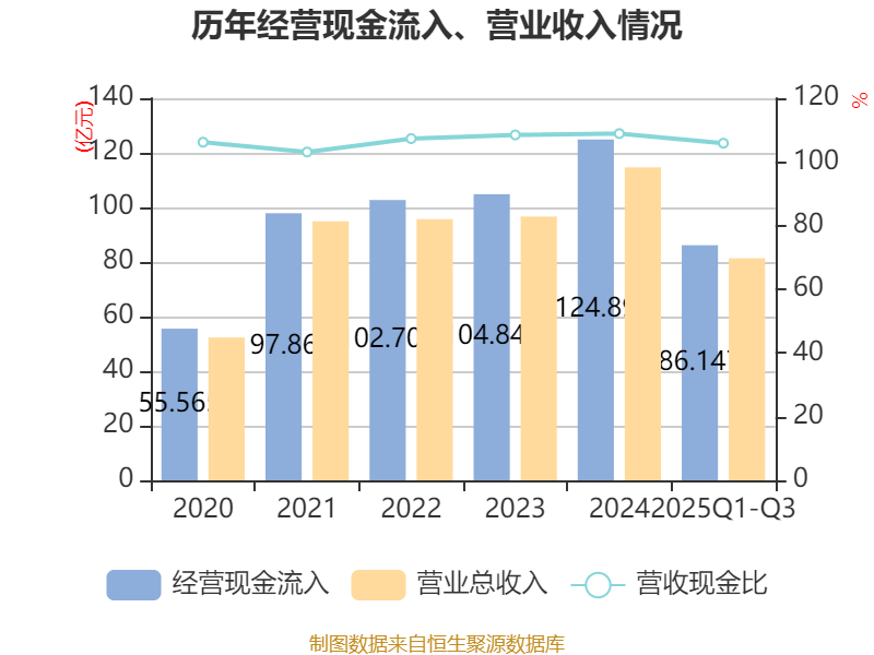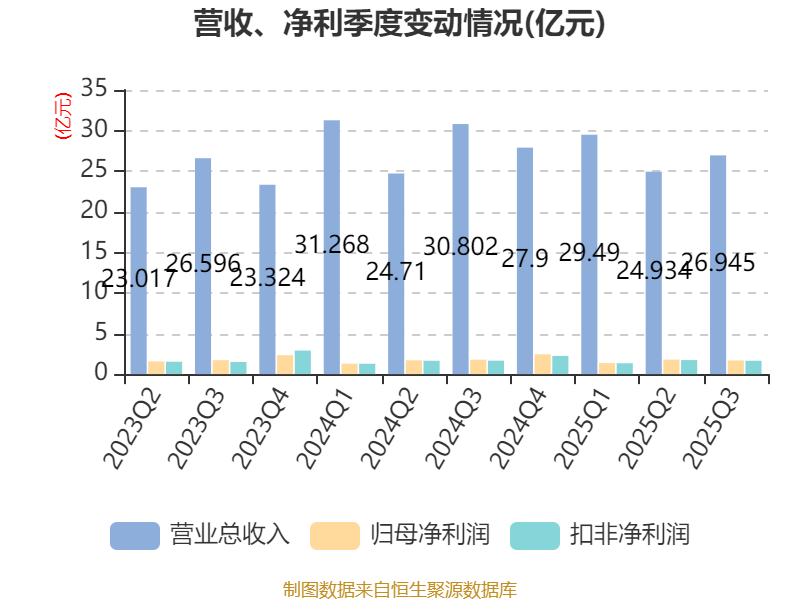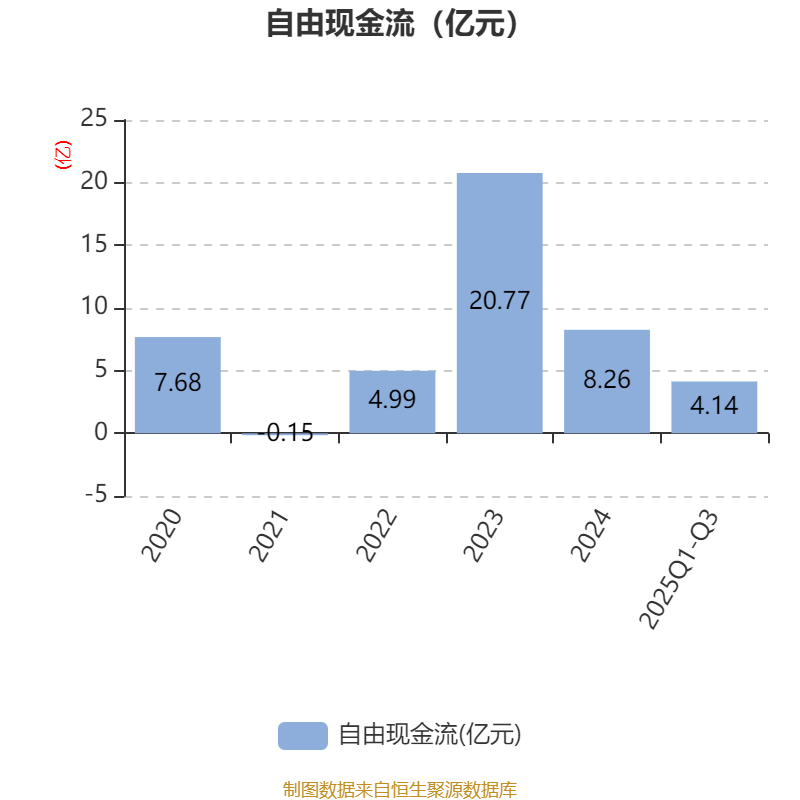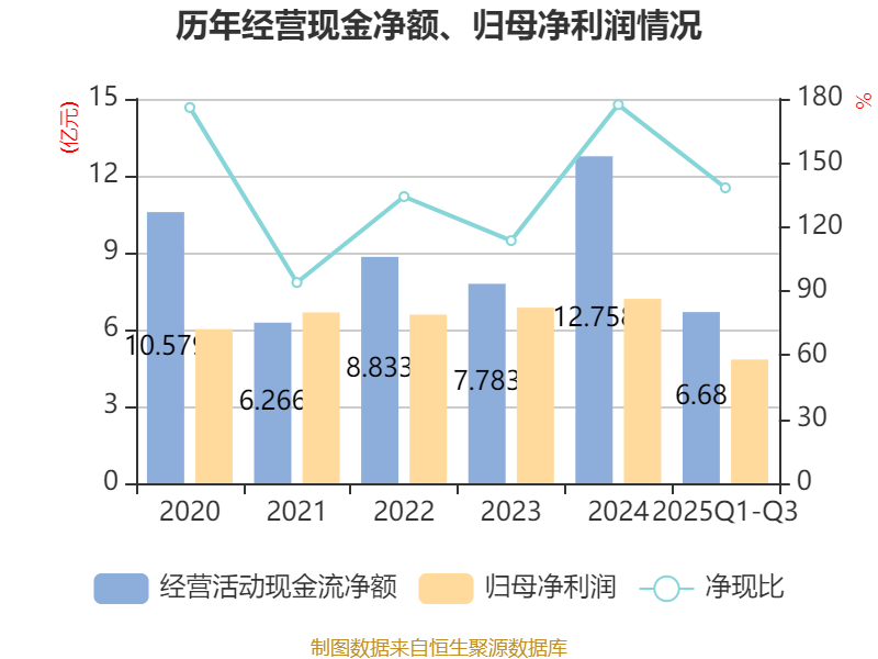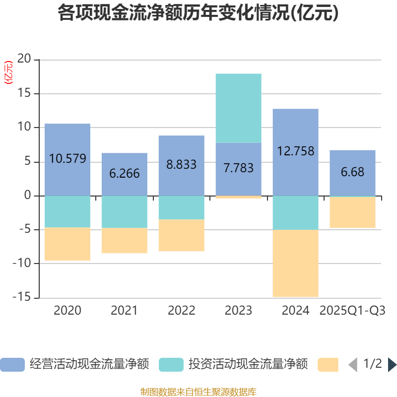 2025年前三季度,公司经营活动现金流净额为6.68亿元,同比下降20.13%;筹资活动现金流净额-4.53亿元,同比增加1.24亿元;投资活动现金流净额-2044.78万元,上年同期为-3.46亿元。