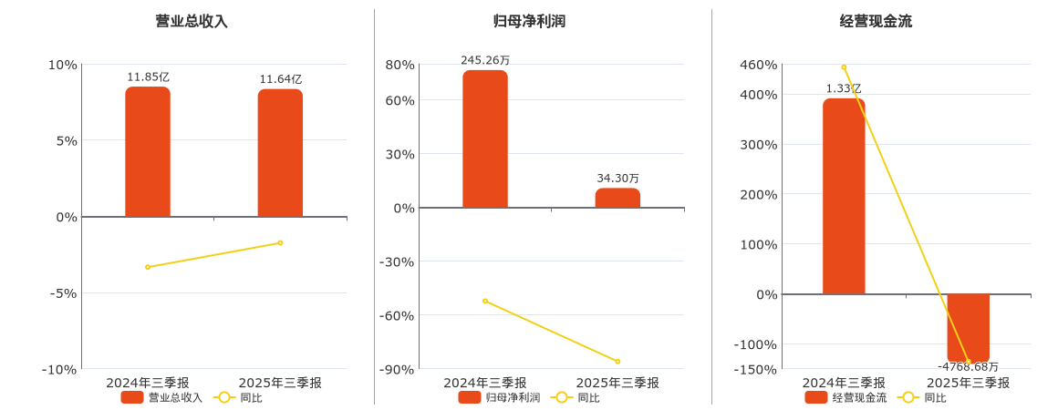 公司营业总收入为11.64亿元,较去年同报告期营业总收入减少2072.75万元,同比较去年同期下降1.75%。归母净利润为34.30万元,较去年同报告期归母净利润减少210.97万元,同比较去年同期下降86.02%。经营活动现金净流入为-4768.68万元,较去年同报告期经营活动现金净流入减少1.80亿元,同比较去年同期下降135.91%。